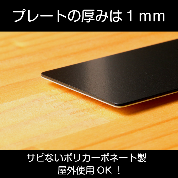 | 備考 | 耐候性の高いポリカーボネート製で軽くて丈夫、 サビなくていつまでもキレイです。 印刷の耐候性も高いので屋外でもご使用いただけます。 裏面には強力な両面テープが標準で加工してあり、 ツルツルで平らな面への取り付けであれば、屋外でも大丈夫です |